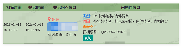 就是有一个快递是从我网点寄出到贵阳分拨中心,到件是有短少的情况的,如下;