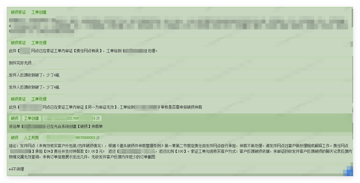 就是是这种的,我是中通快递客服,工作内容就是出港,给商家委屈,比如快递寄出去,发生短少,遗失问题我就处理。现在是有一个快递寄出去了,到第一个分拨中心贵阳发生了外包装破损(那个照片是个正常人都可以看出破了),贵阳方面也登记了内务短少问题件。后面这个件退回了,商家收到了,拍照,然后在群里面反馈“(快递单号)二次包装,内物缺少4瓶,价值15.96元”,然后我就是截屏商家的聊天记录,去打“破损工单”,但是后面判责的时候,上海的仲裁部门是这种判责的“结论:发件网点(未有效核实客户外包装/内件破损情况),根据《遗失破损件仲裁管理条例》第一章第二节裁定责任由发件网点自行承担,仲裁不做处理。请发件网点对客户做好理赔或解释工作。责任网点【我的网点】承担【0%】责任并支付仲裁款【0.00】元; 返还【我的网点】【0】元,返还比例【100】。索证工单勾选核实客户方式:客户反馈破损依据,未举证的收发件客户反馈破损的聊天记录反馈内物情况属无效查询,未有订单信息展示发出几件,无收发件客户反馈内件短少的订单截图。”,意思就是说,这个的意思通俗易懂就是,我选择的是“客户反馈破损依据”,但是我提供的依据里面没有收件人反馈的破损短少(没有露出单号,不能证明是商家反馈的)。