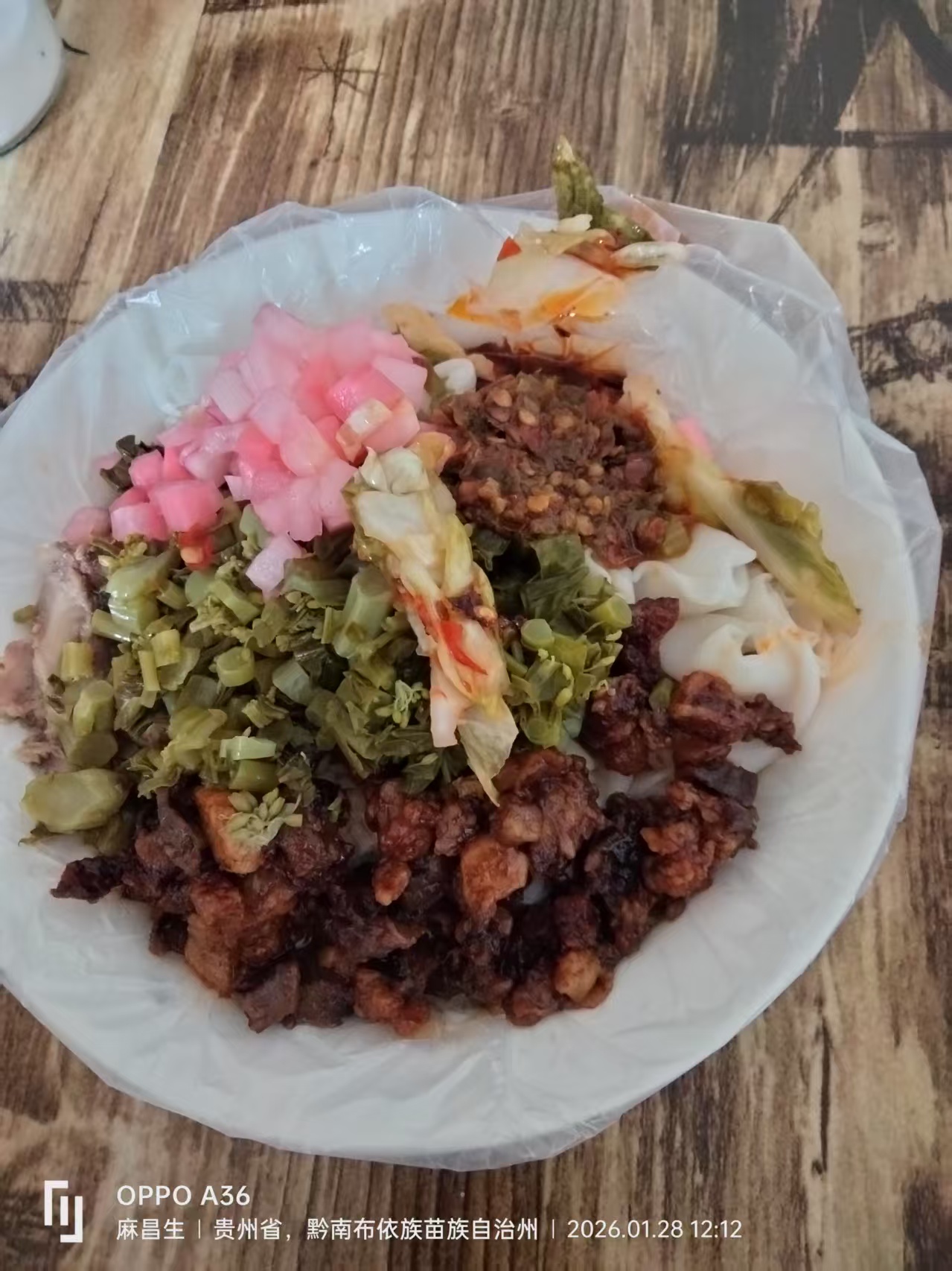 在板康的剪粉,我感觉这个肉沫(上面那个乌漆墨黑的东西)不好吃,像是油砸。然后是他们这边说的语言,想是布依话,我又有点听不懂……