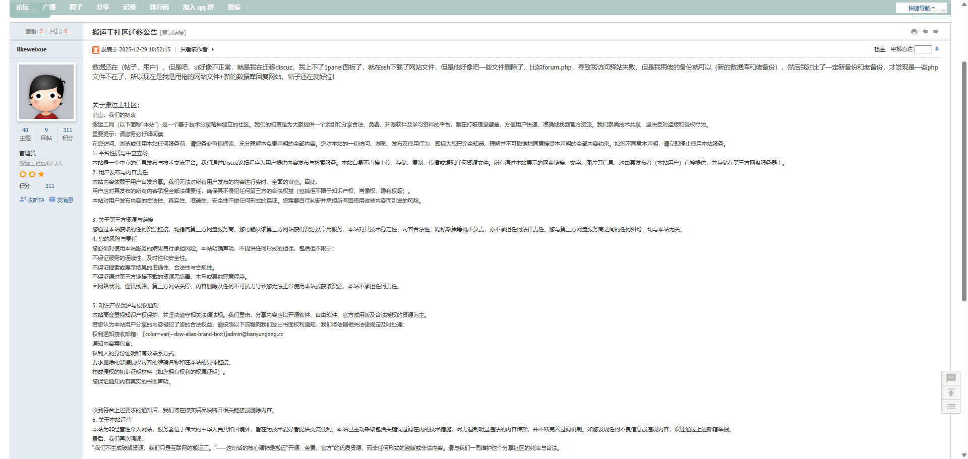 搬运工banyungong.cc是我在上一年7月左右用discuz弄的一个网盘社区(其实我弄了很多很多很多网站,比如phpbb,discuz,wmcms啥的~)。当时是有一个漏洞属于是,比如一个百度网盘的svip是6tb这种,那么就可以开一个月,然后吧自己长时间不用的资料啥的放进去,然后设置分享链接,时间永不过期,然后需要的时候,自己再去把自己分享的东西保存下载(我有两个百度网盘账号,都有svip,只是空间不够了~)。属于换句话说,搬运工社区理论上是一个“备忘录”,记录下网盘链接而已。